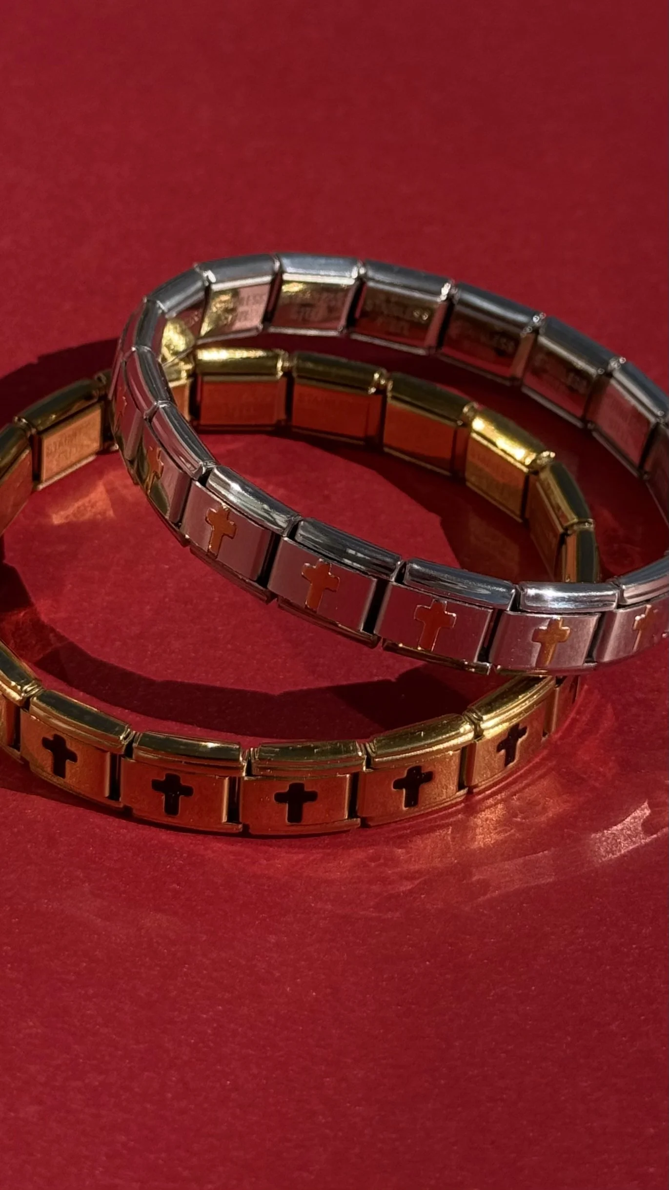 The gold bracelet has black crosses & the silver bracelet has gold crosses (as shown in the photos).